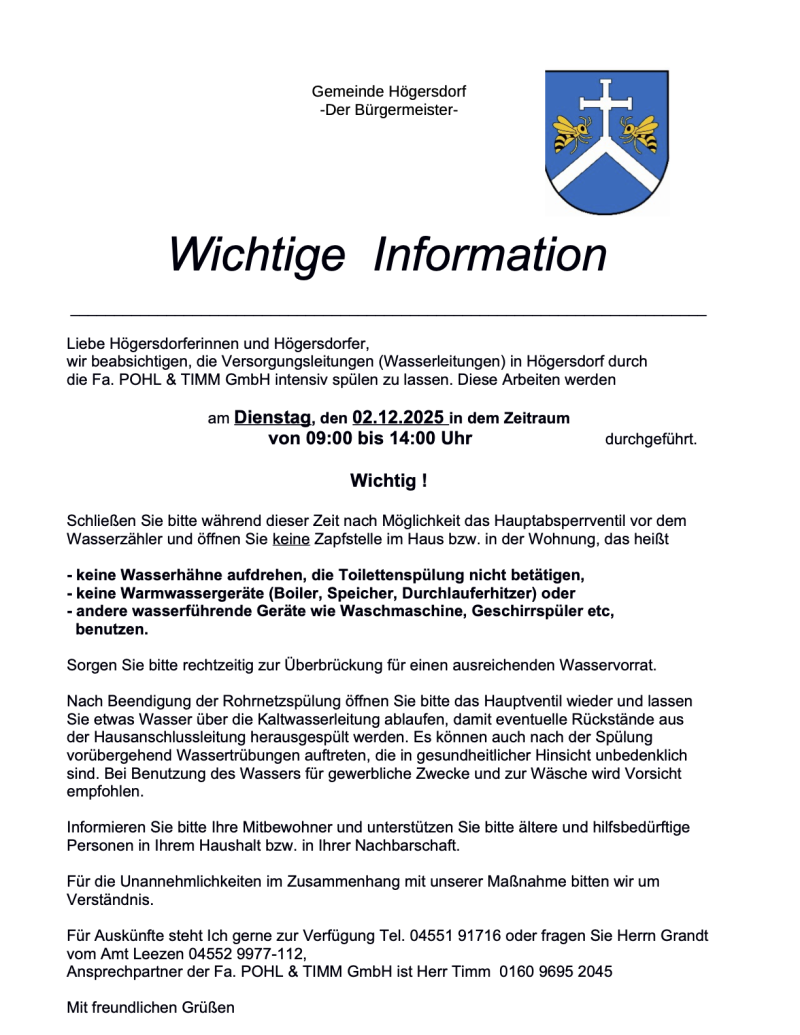 Spülen der Wasserleitungen im Ortsteil Högersdorf